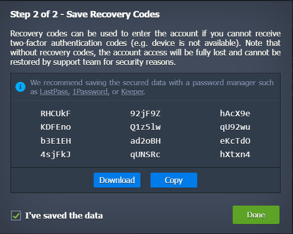 Remember to save the shown recovery codes using the Download/Copy buttons as the old ones don’t work anymore.
