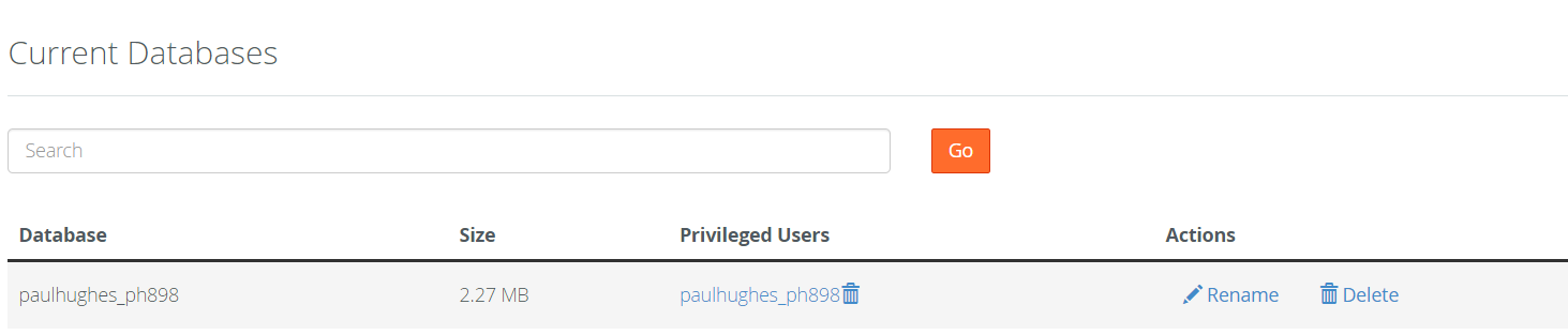 Next, scroll down to the list of current databases in your hosting account. This list displays all the MySQL databases associated with your account, allowing you to view and manage each one.