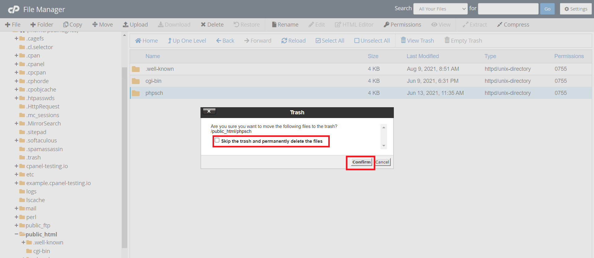 6. Select the checkbox for confirming delete action and select Confirm Button. Selected Folder will be permanently deleted